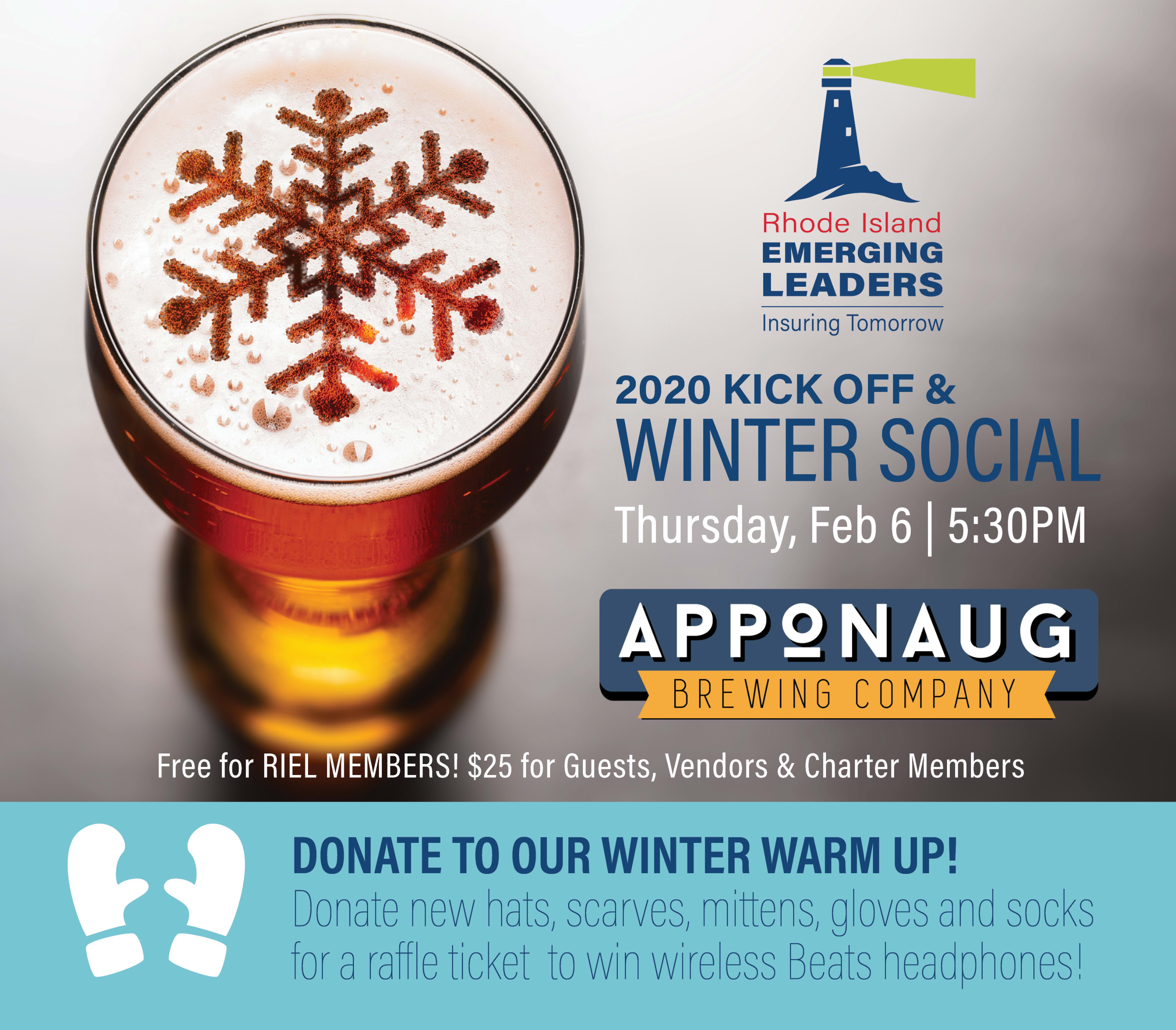 Come join the Emerging Leaders at Apponaug Brewing Company for a 2020 Kick Off & Winter Social. This event is free for RIEL Members and $25 for Guests, Vendors & Charter Members. We will also be collecting hats, scarves, mittens, gloves and socks for donation - bring your items for a chance to win wireless Beats headphones!
